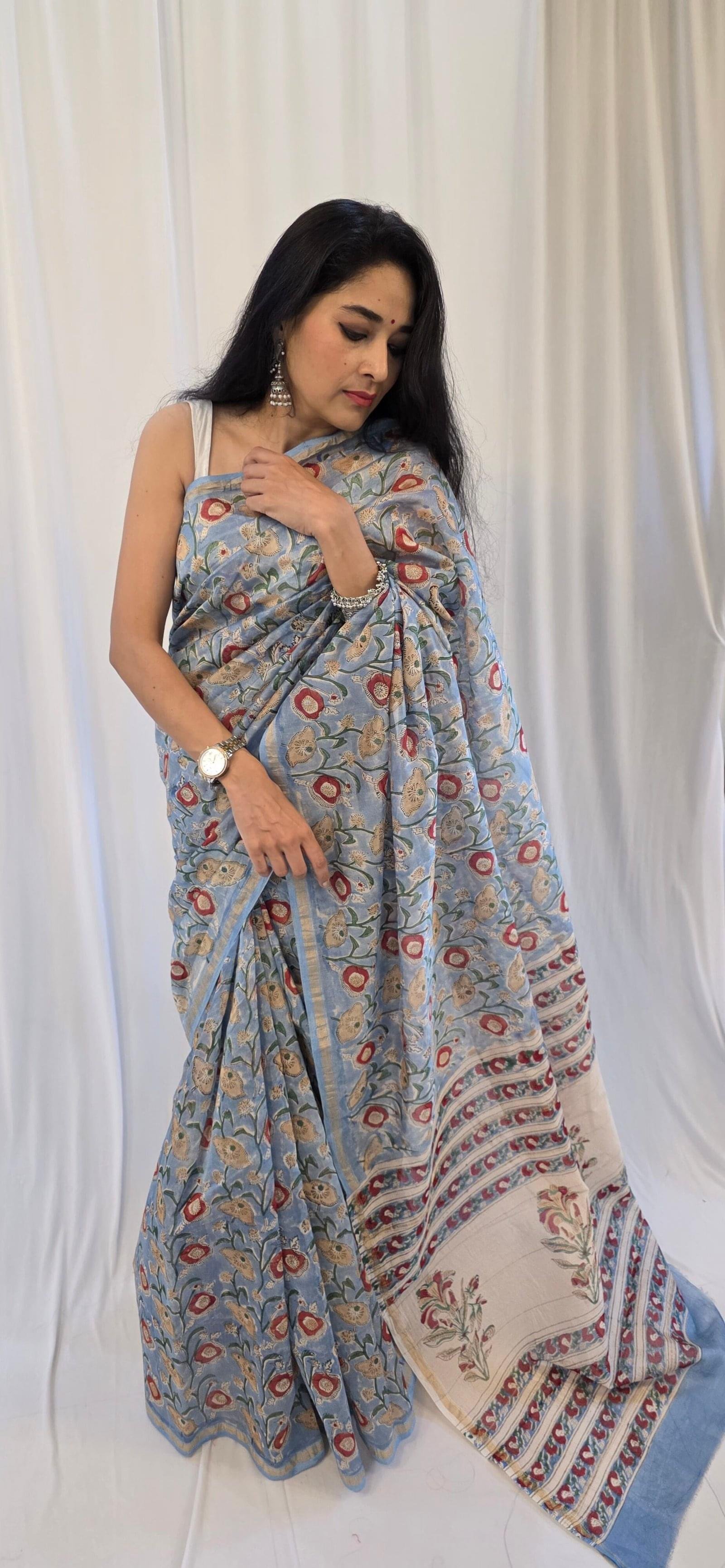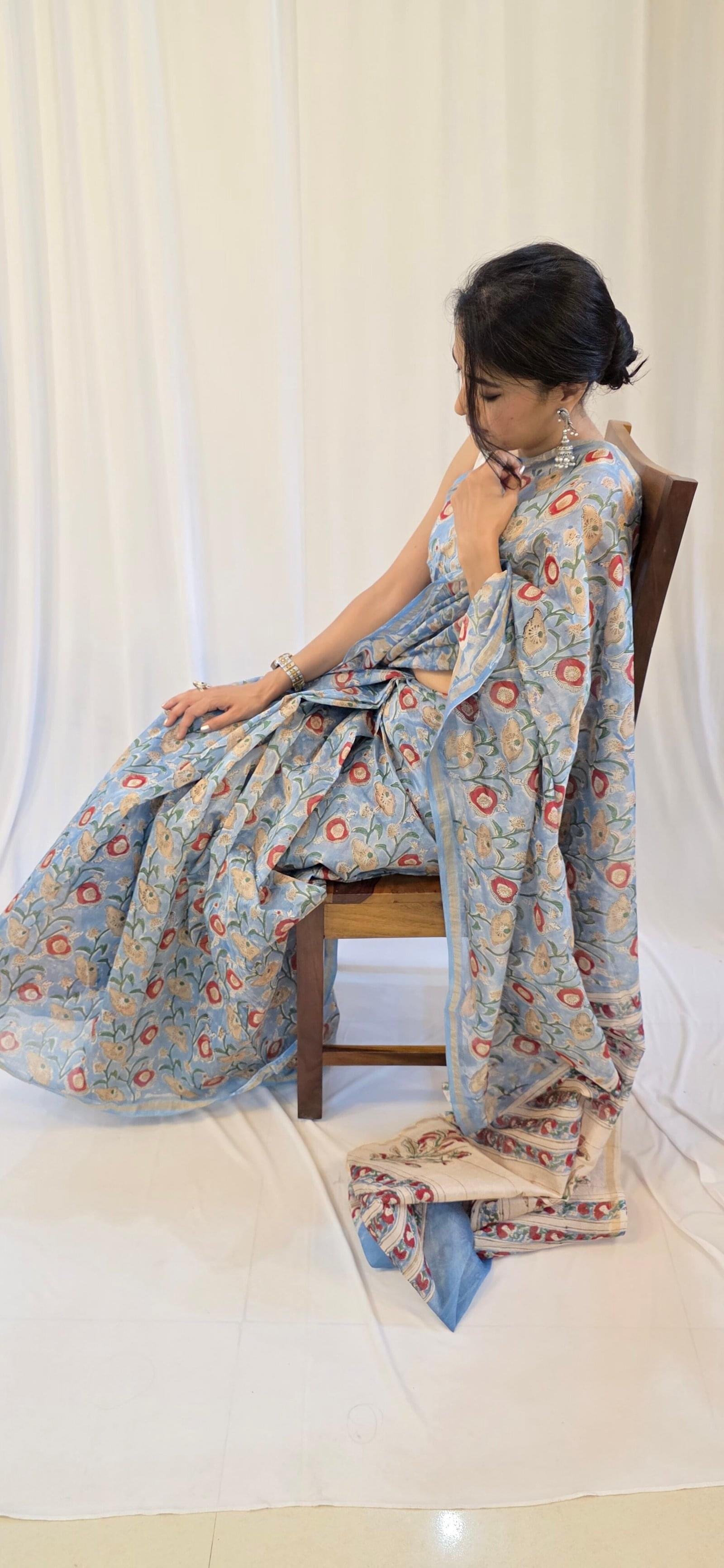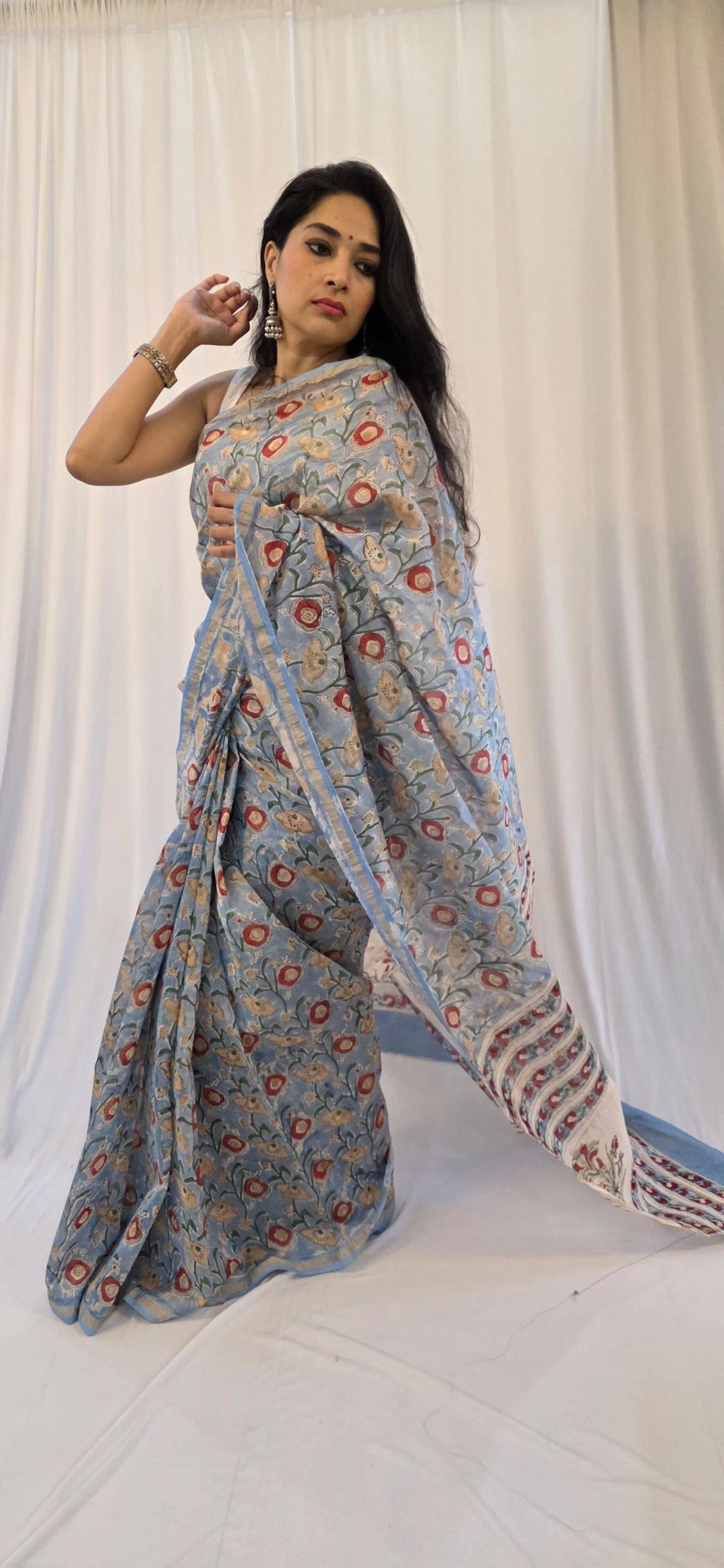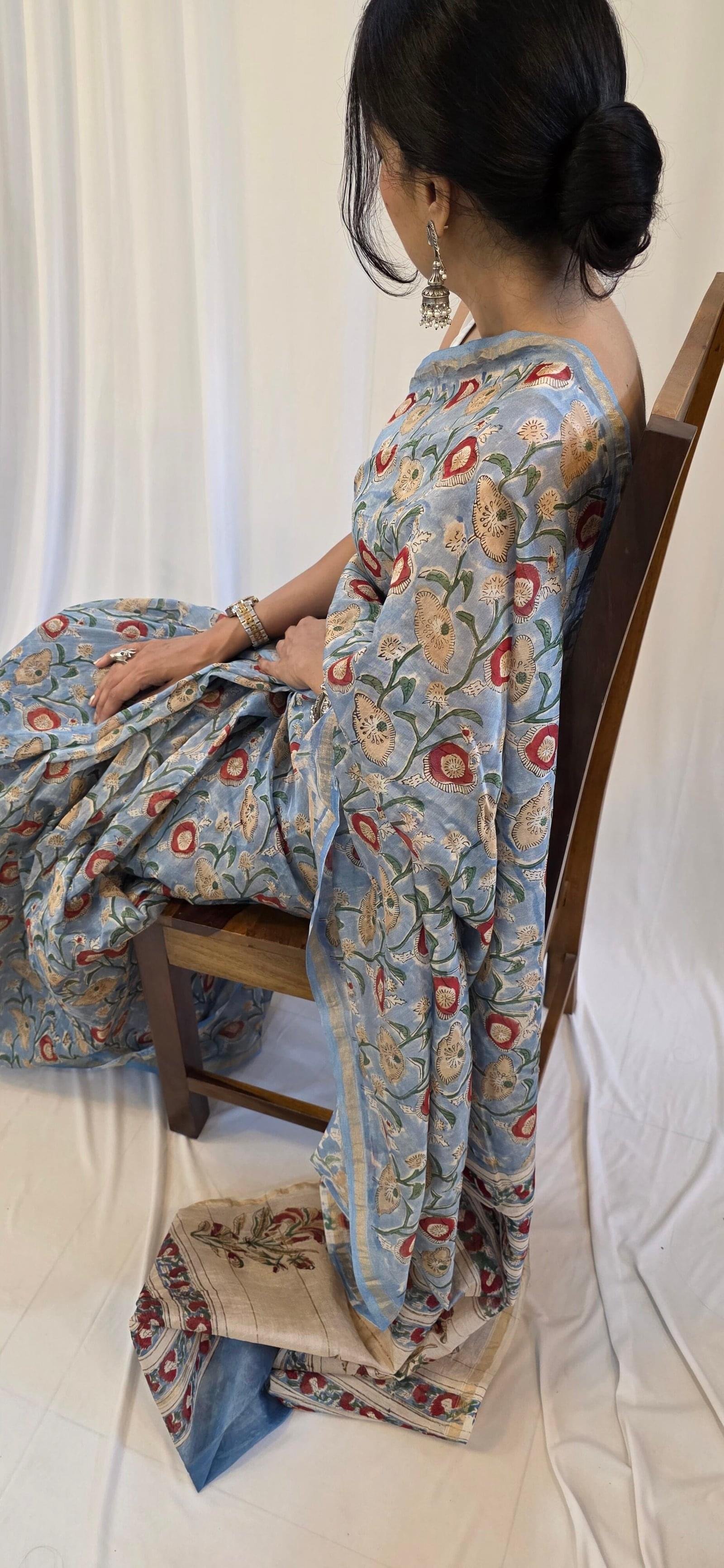 Sky Blue Chanderi Handblock Print Saree in Silk-Cotton Blend